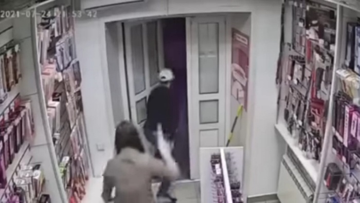Um vídeo de uma atendente de shop adulto expulsando um ladrão com um brinquedo viralizou pelas redes sociais.